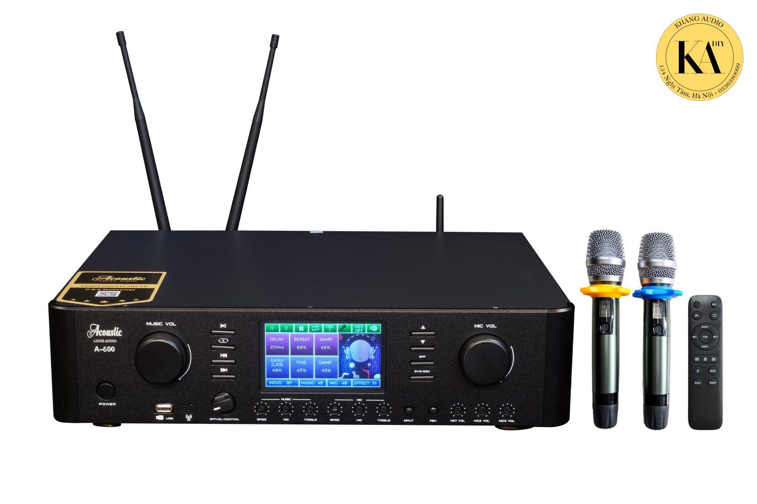 Màn hình LCD 4.3 inch trên A600 hiển thị thông tin trực quan, giúp người dùng dễ dàng theo dõi và tùy chỉnh. Các nút điều khiển vật lý được bố trí rõ ràng, cho phép truy cập nhanh các chức năng chính. Ngoài ra, việc hỗ trợ điều khiển từ xa (Infrared remote control) giúp bạn thuận tiện điều chỉnh âm thanh và tùy chọn nguồn phát, chế độ hát karaoke từ xa.