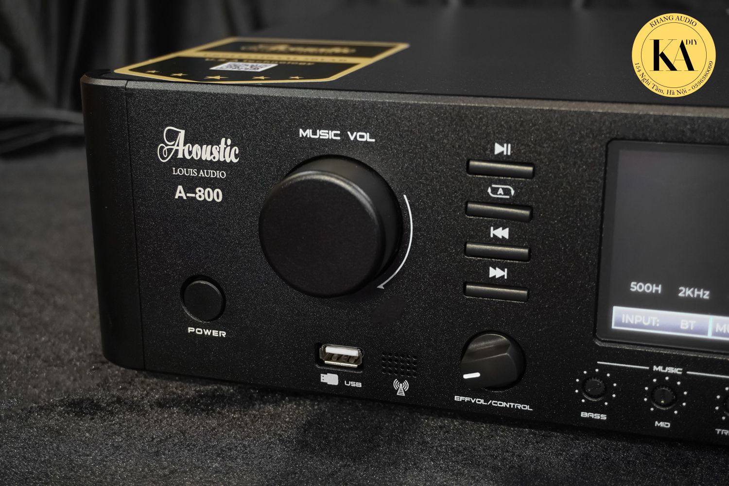 Amply A800 có thiết kế hiện đại với mặt trước nổi bật là màn hình LCD 4.3 inch hiển thị sắc nét , cho phép bạn dễ dàng trực tiếp tùy chỉnh âm thanh. Màn hình này còn có khả năng Hiển thị phổ tần (Spectrum Display) với các dải tần số cụ thể như 500Hz, 20KHz, 4KHz, 5KHz, KHz, 10KHz. Các nút xoay lớn cho âm lượng nhạc (MUSIC VOL) và âm lượng micro (MIC VOL) được bố trí khoa học, cùng với các nút điều chỉnh bass, mid, treble cho cả nhạc và micro, giúp người dùng dễ dàng thao tác.