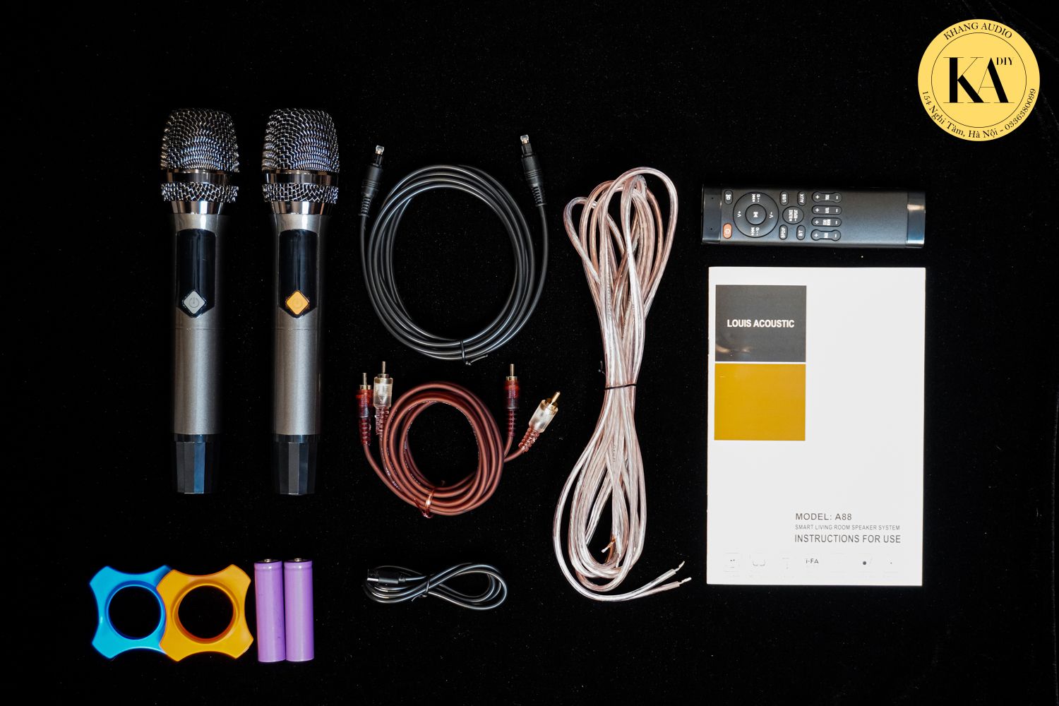 | Phụ kiện đi kèm | Dây nguồn, dây loa dài (3.6m), điều khiển, 2 Microphone, dây sạc micro | |