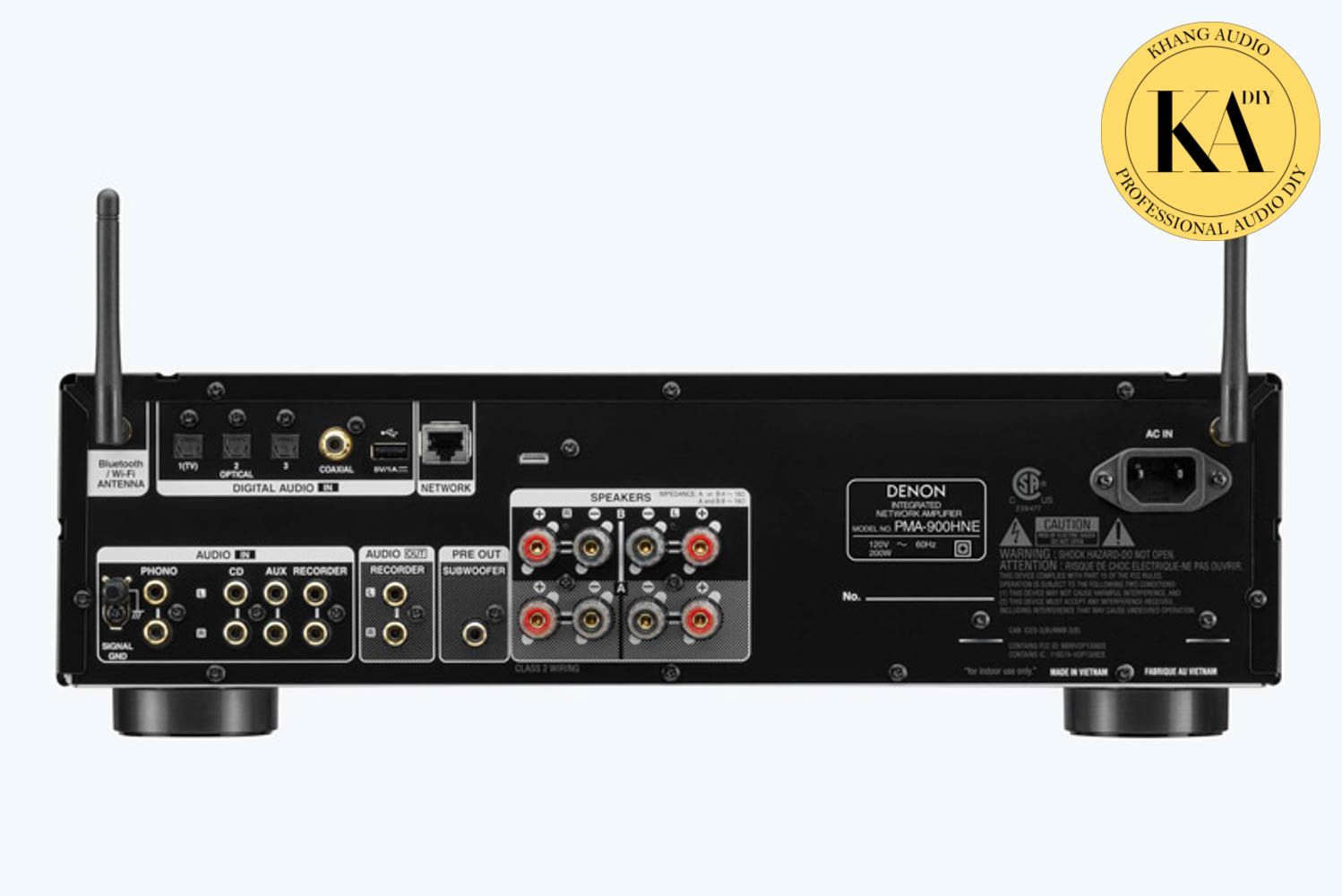 Các cổng kết nối với Amply Denon PMA 900HNE được thiết kế ở mặt sau sản phẩm với hệ thống cổng giắc chắc chắn. Đi kèm với đó, chiếc amply nghe nhạc PMA 900HNE này được trang bị mạch xử lý 24bit/192kHz, cho phép tiếp nhận và giải mã tín hiệu nhạc số độ phân giải cao chuẩn Hi-Res (bao gồm cả DSD 2,8MHz và 5,6MHz) thông qua các đầu vào Optical và Coaxial.