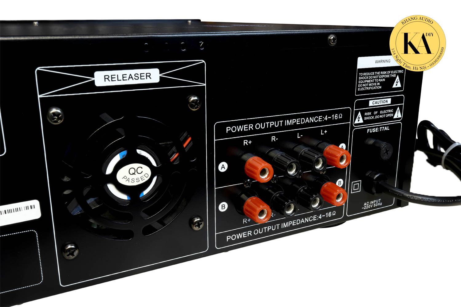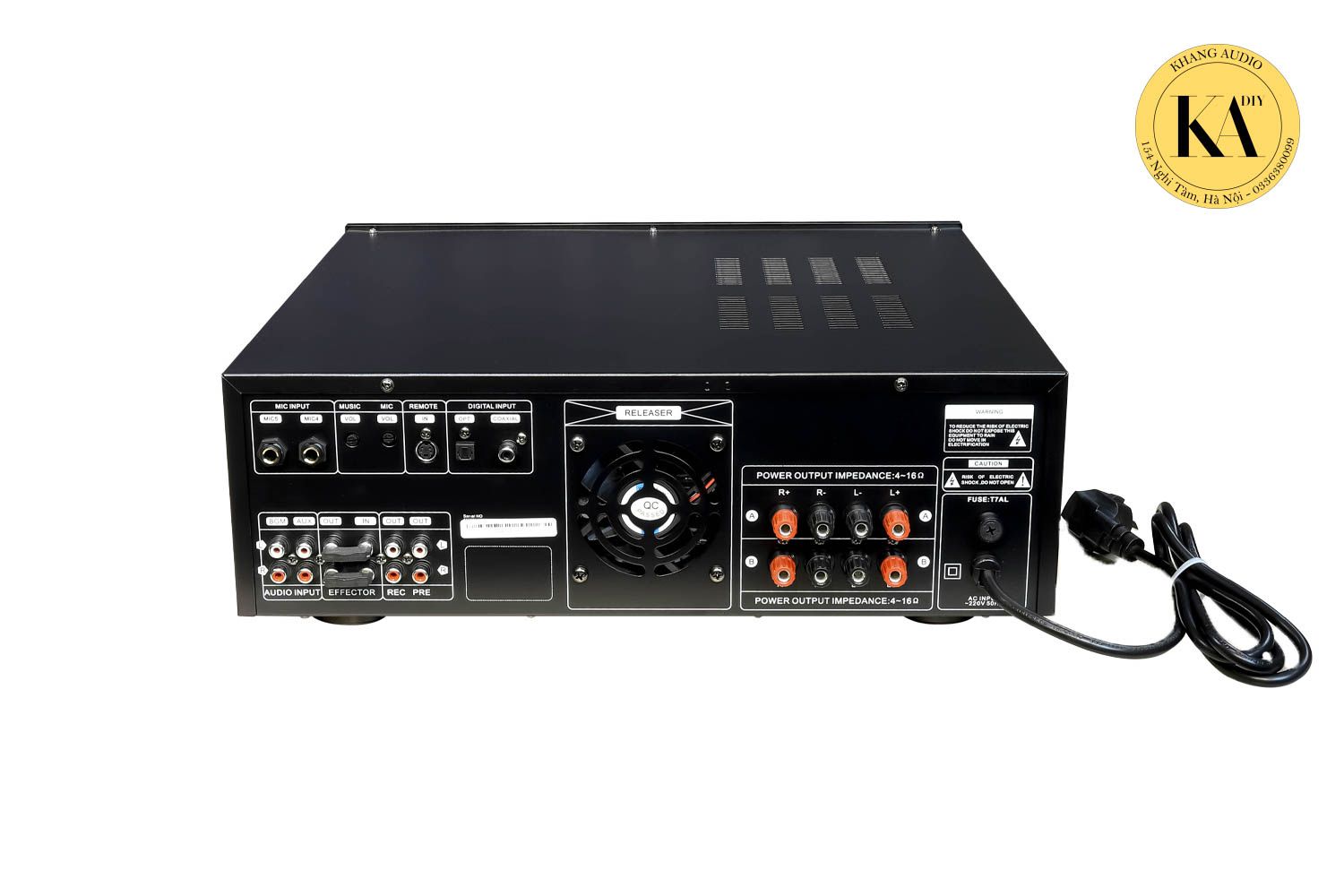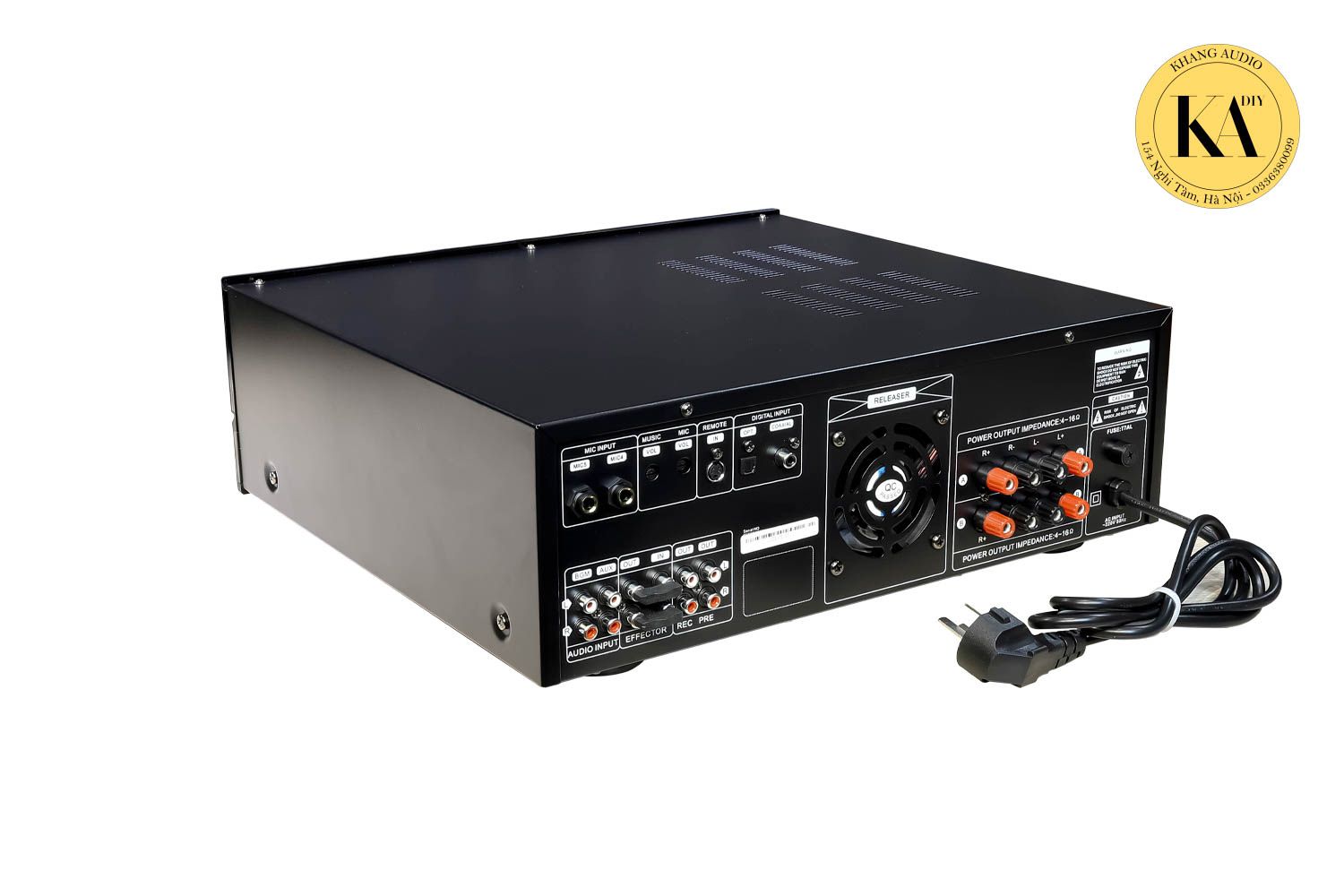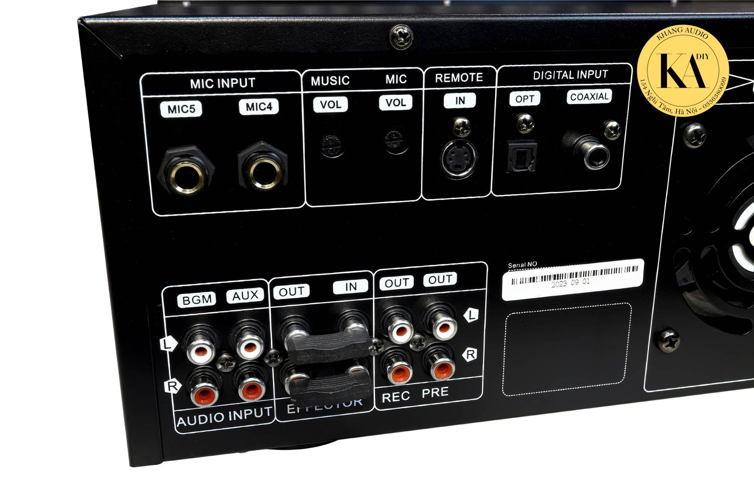 Mặt sau amply là rất nhiều các cổng kết nối khác nhau như: cổng nguồn, output, HDMI, Mic input, Optical… giúp dễ dàng kết nối với nhiều thiết bị khác nhau trong dàn âm thanh, thuận tiện trong quá trình sử dụng cho quý khách hàng.