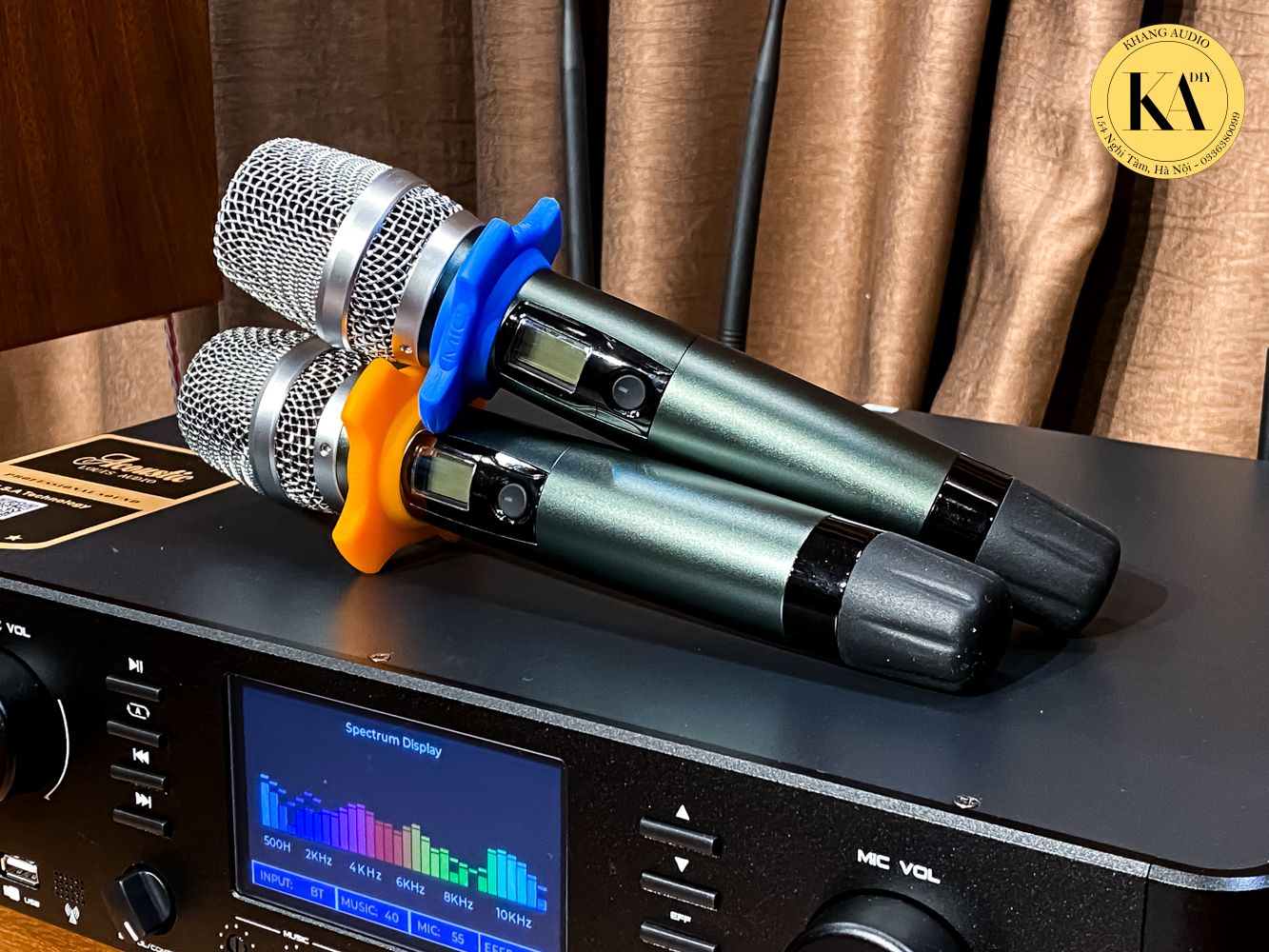 Micro Không Dây Cao Cấp: Tích hợp sẵn 2 tay micro không dây UHF bắt sóng xa và ổn định, có khả năng chống hú rít hiệu quả.