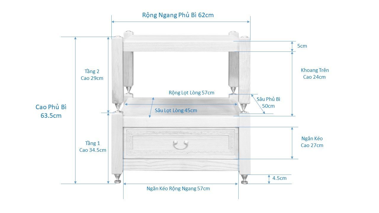 Kích thước: Rộng 62cm x Sâu 50cm x Cao 97.5cm Chiều cao tầng (tính cả chân đinh chén hứng): Tầng 1 cao 34.5cm; Tầng 2 cao 29cm Chiều cao khoang: Khoang giữa tầng 1 và 2 cao 24cm Ngăn kéo chứa được 100 đĩa CD Mặt ngăn kéo đục chạm chữ triện |