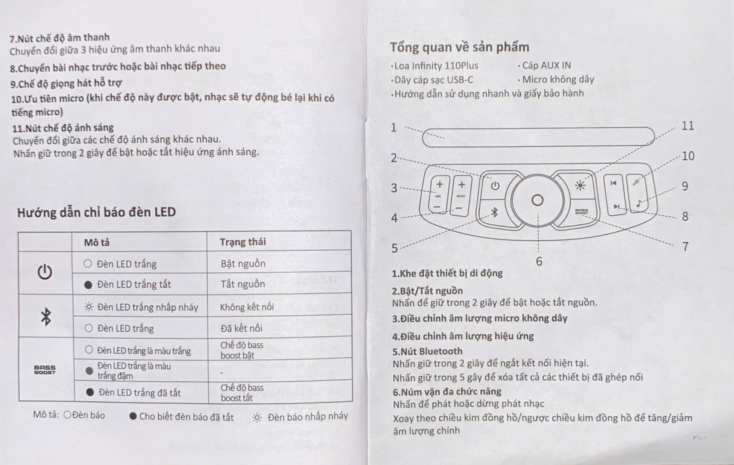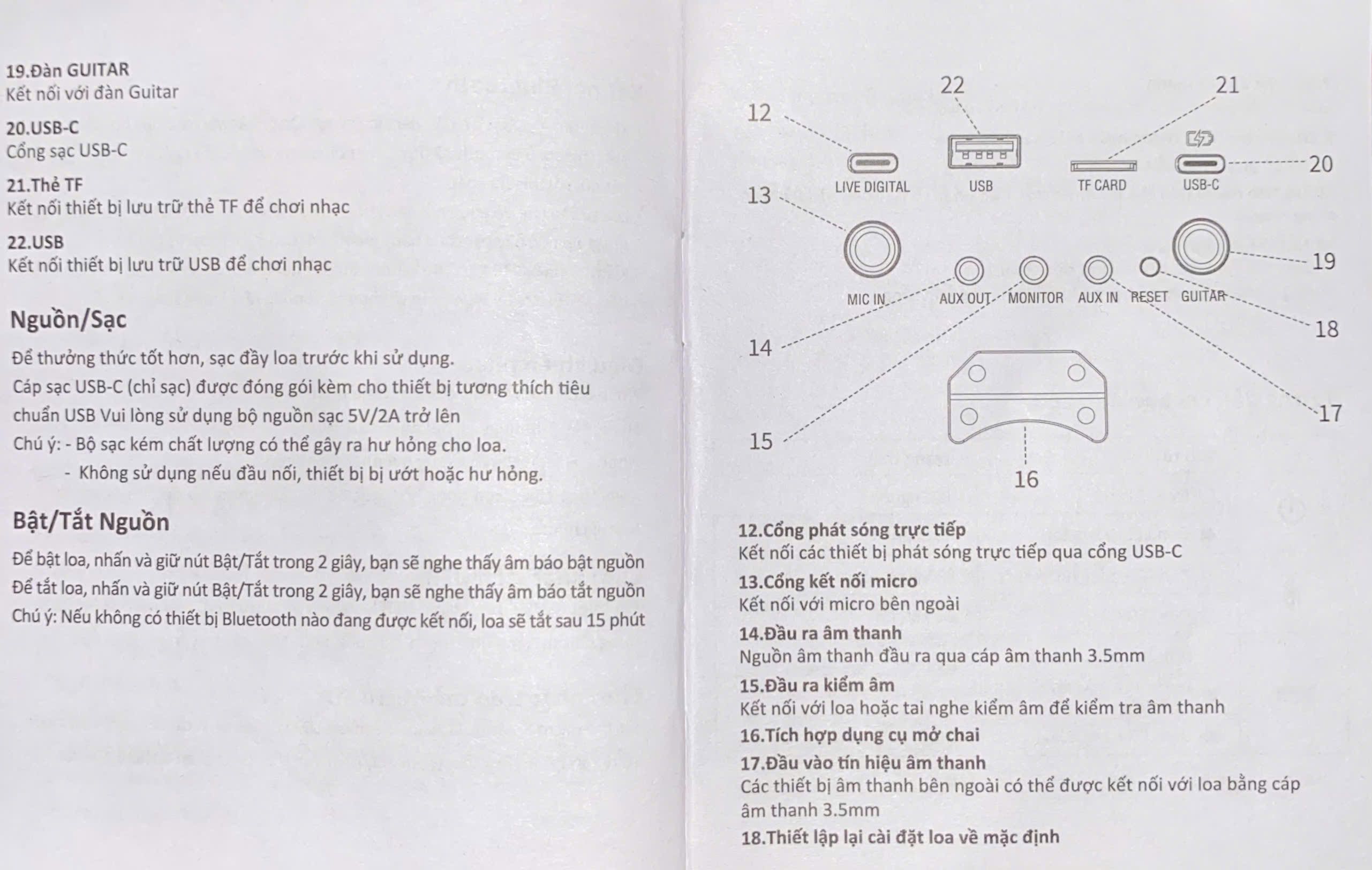 | Kết nối đầu vào | BT, AUX, TF, U-disk, Mic, Guitar, Monitor, Type-C | |