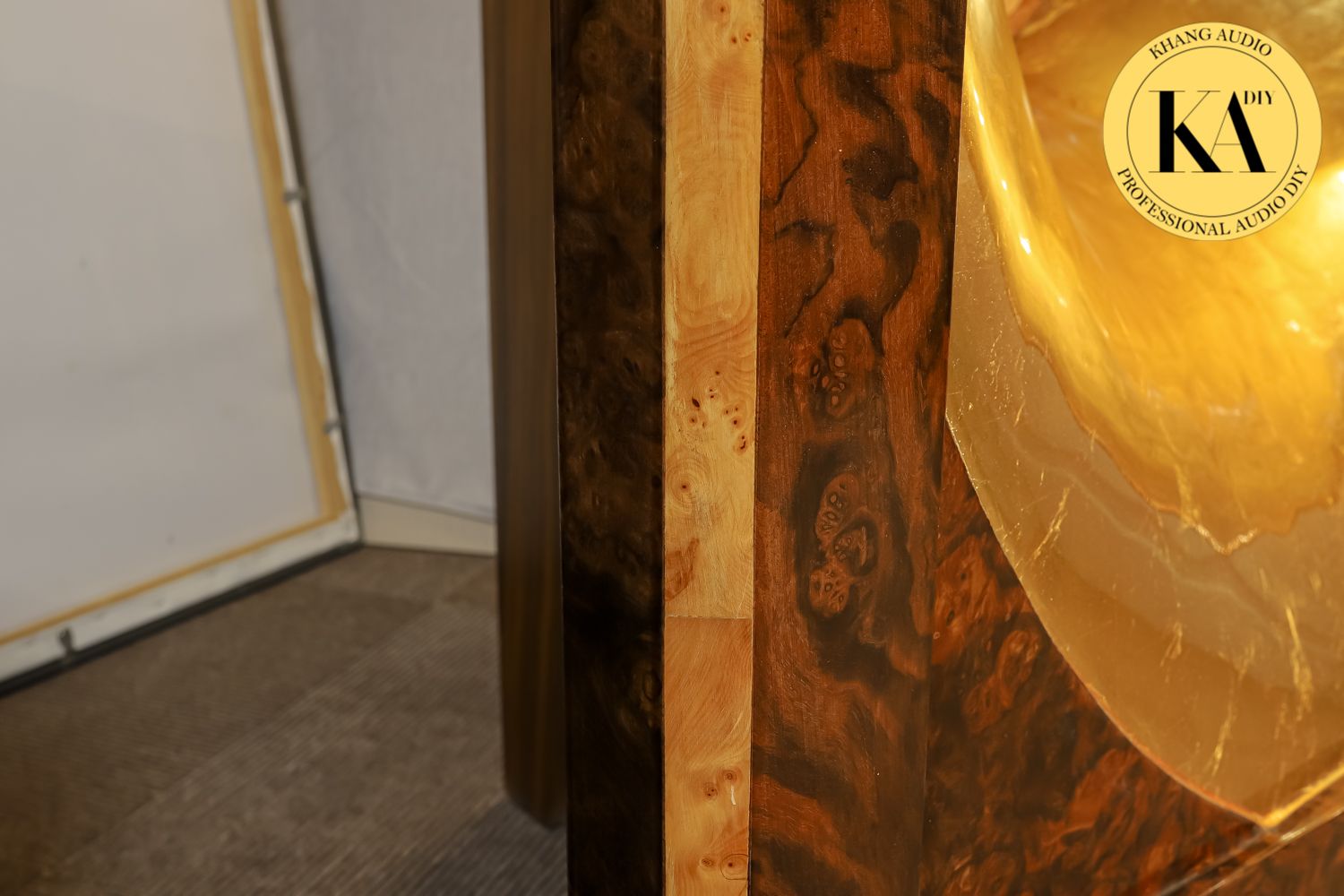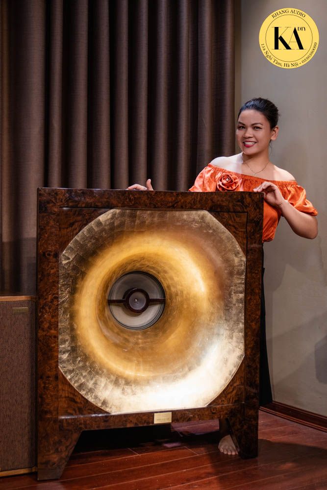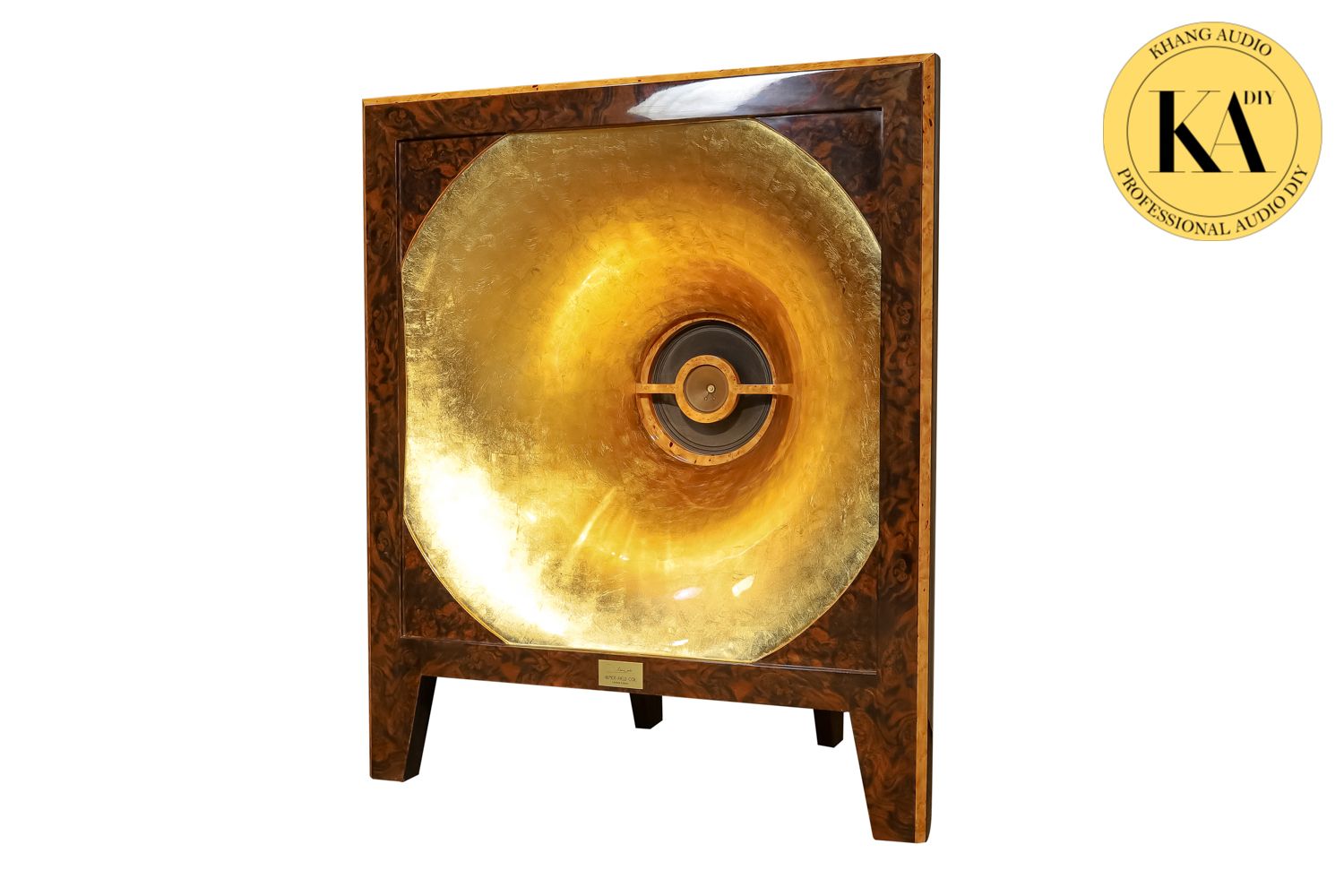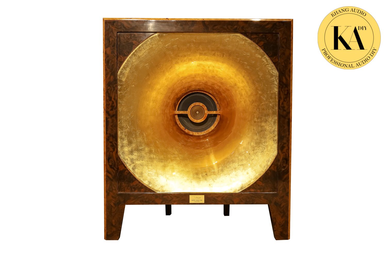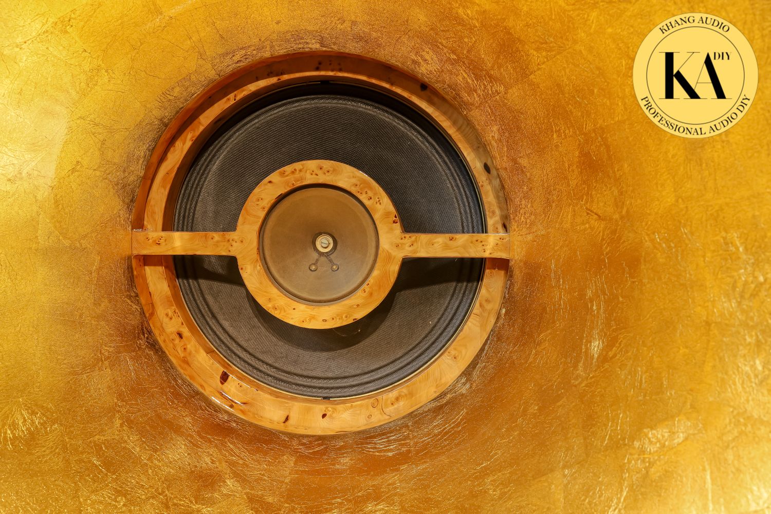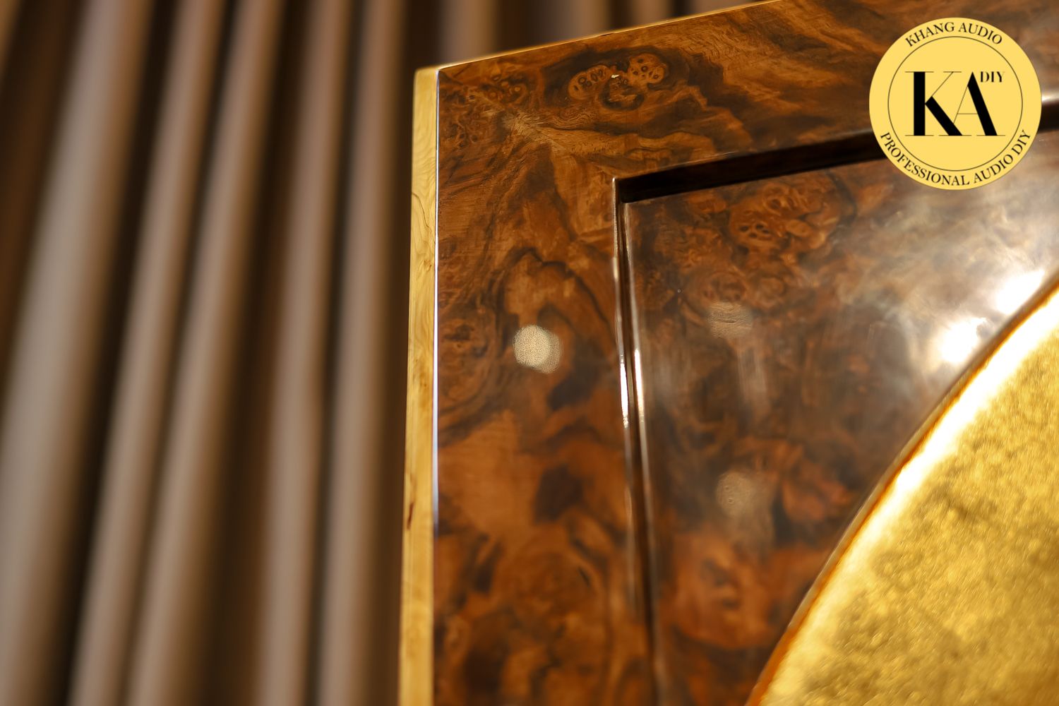 Vật liệu làm thùng loa: Gỗ dán cho audio và hoàn thiện gỗ óc chó, sơn bóng piano, kèn tre dát vàng